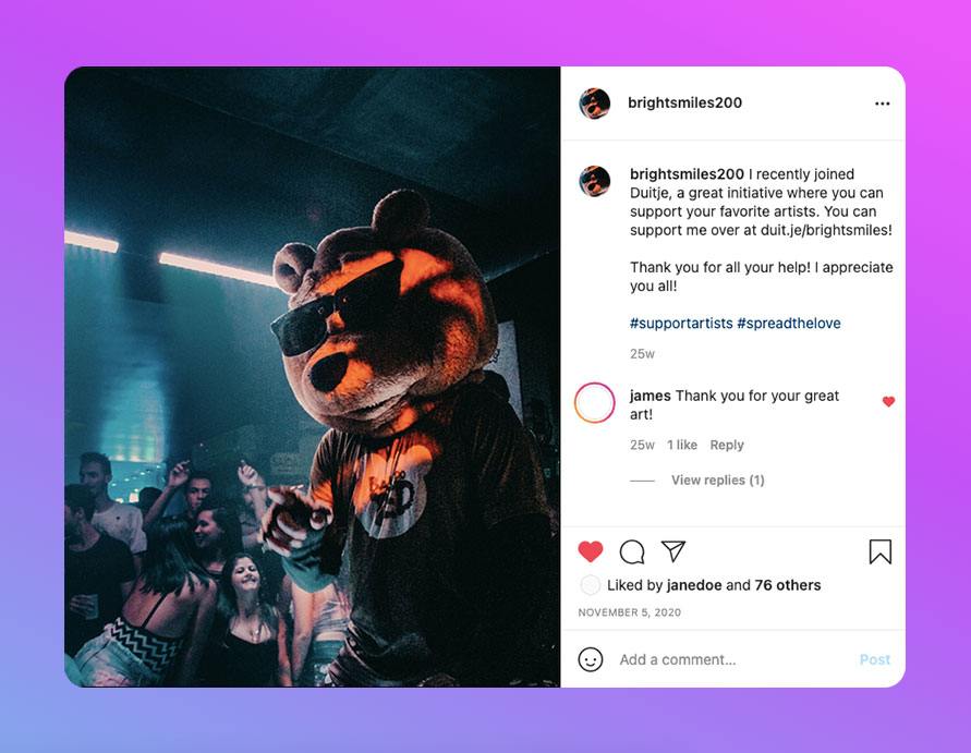Kom je een fantastische kunstenaar tegen? Deel de liefde en nodig hem of haar uit voor Duitje! Samen steunen we de kunst.